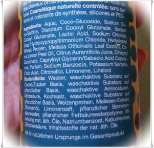 Wasser, waschaktive Substanz auf Cocos/Zucker Basis, waschaktive Substanz auf pflanzl. Basis, waschaktive Aminosäuren, Milchsäure, Kochsalz, waschaktive Substanz auf pflanzl. Basis, Weizenprotein, Melissen-Extrakt, Zitronenöl, Limonensaft, pflanzlicher Bernsteinsäureester, pflanzlicher Fettsäureesterpolymer, Mischung nat. äth. Öle, Natriumbenzoat, Kaliumsorbat, Zitronensäure, Inhaltsstoffe der nat. äth. Öle