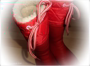 Oberhalb der Gummistiefel befindet sich abgesteppter Stoff der passend zum Gummi gewählt wurde und mit einem Schnürsenkel, kannst Du sie zusätzlich noch einmal am Schienbein verengen und