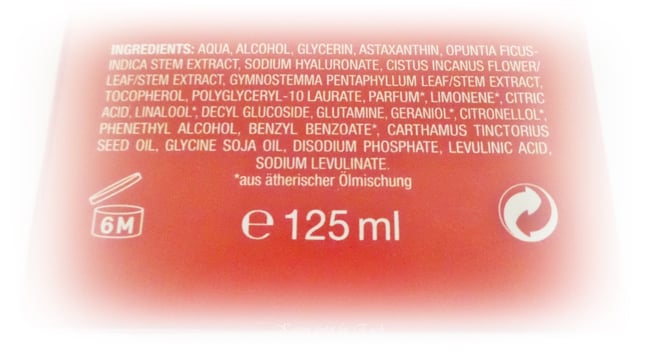 Deutsche Übersetzung: Wasser, Alkohol, Glyzerin, Astaxanthin (aus der Alge Haematococcus pluvialis), Feigenkaktus Extrakt, Hyaluronsäure, Zistrosen Extrakt, Unsterblichkeitskraut Extrakt, Vitamin E, Glyzerin-Fettsäureester, Ätherische Ölmischung, Limonene**, Zitronensäure, Linalool**, Fettsäurederivat mit Zuckeranteilen, Aminosäure, Geraniol**, Citronellol**, Phenethyl Alkohol, Benzyl Benzoate**, Distel Öl, Soja Öl, Dinatrium Phosphate, Levulinsäure, Natrium Levulinate