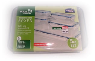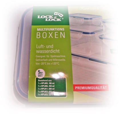 Durch die Entwicklung eines ganz speziellen Silikonrings am Rand der Deckel der Lock & Lock Boxen, lassen sich Boxen hermetisch (leicht und sicher) verschließen und sind sehr dicht. Die Dosen nehmen keine Gerüche (auch nicht bei Zwiebel oder Fisch) und keine Verfärbung (z.B. Tomatensosse) an.