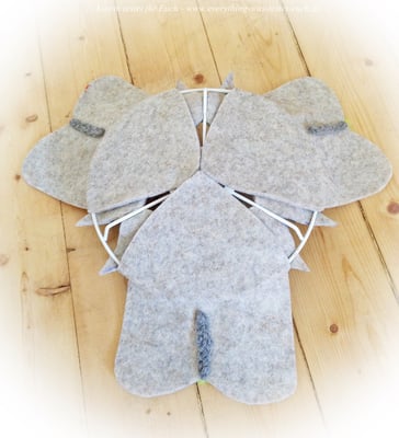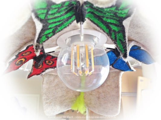 Zuerst habe ich natürlich Freihand meine Idee auf den Filz gezeichnet, danach mit dem Rollschneider ausgeschnitten und auf die Lampenhalterung mit Hilfe der Heißklebepistole angebracht. Die Farbe (Acryl) habe ich erst zuletzt auf den Filz aufgetragen, sowie auch die Wolle.