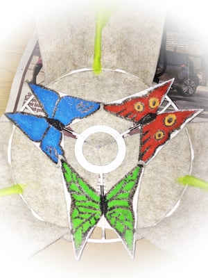 Meine Idee war es - drei angedeutete Blätter und drei Schmetterlinge (habe ich im Internet herausgesucht) miteinander zu verbinden. Viell. ist es nicht so ganz zu 100 Prozent geworden, aber ich bin mit meinem Ergebnis sehr zufrieden und mein Arbeitszimmer hat jetzt eine schöne selbst gebastelte Lampe :) ...