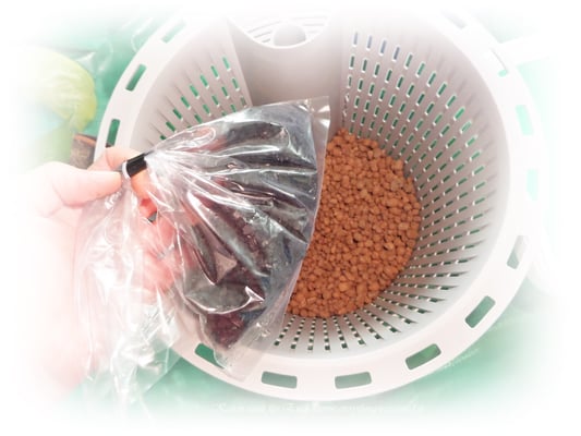 Bild 2 - Zuerst das mitgelieferte rötliche Substrat in den Pflanzkorb geben, danach die mitgelieferte Aktivkohle darauf geben und beides gut miteinander vermischen.