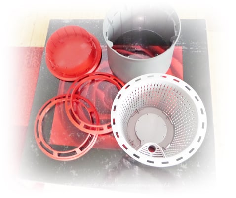 Der Topf (Bild 2) besteht aus einem Pflanzkorb (hellgrau) - da kommt das Substrat und die Zimmerpflanze hinein. Einer Auffangschale (rot), worin sich das Wasser (Wassertank) dann befindet und zwei Ringen (rot), die am Ende die Luft in die Wurzel hineinlassen, sowie einer Ummantelung (dunkelgrau), die das ganze System zusammenhält und den Pflanzkorb schützt.