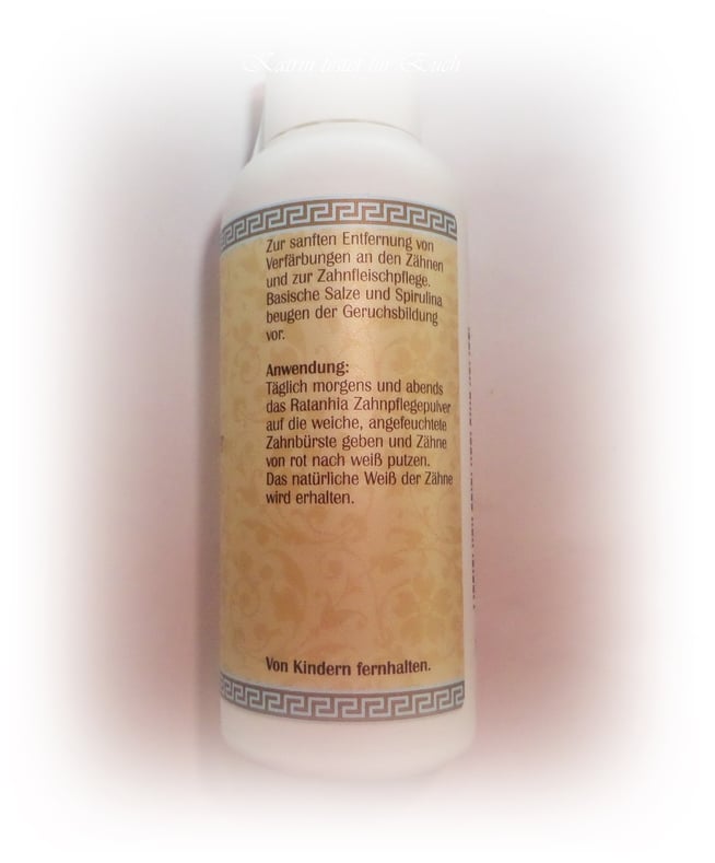 Die Flasche des Ratanhia Zahnpflegepulvers gefällt mir durch die griechische Bordüre auf dem Etikett sehr gut und wirkt für mich dadurch etwas edel. Das Etikett ist dennoch schlicht gehalten, aber sticht durch diese Bordüre verlockend ins Auge.