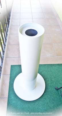 Das Rohr hat eine Höhe von 1 m mit einem Durchmesser von 15 cm und der Standfuß mit 45 cm. Fast alles vom Kamin ist aus Edelstahl, bis auf das Schutzglas (Glaszylinder) und und die