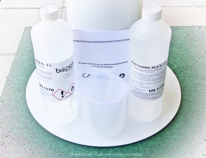 Das Zubehör, was man natürlich zusätzlich kaufen muss, besteht aus - Bioethanol (96,6 Prozent), sowie einem Trichter und einem Meßbesser. Das Starter-Kit dafür kostet ab 6 Liter Bioethanol UVP 28,00 Euro. Mitgeliefert wird zum Standkamin ein Flammenlöscher - sieht man ganz unten im Bild.