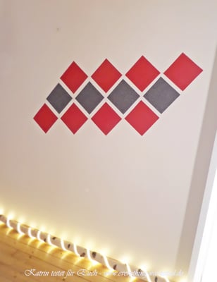 Damit die Wand oben darüber dann nicht so leer aussieht, habe ich über dem Birkenstamm ein Deko mit Filz-Vierecken (selbstklebende Teppichfliesen aus Filz) angebracht und so passt sich beides miteinander an, verknüpft sich zu einem Ganzen.
