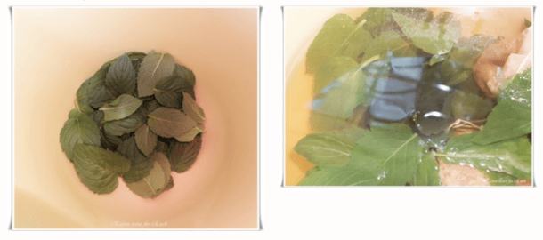 Zuerst die frischen Minzblätter (ca. halbe Pflanze) in ein hohes Gefäß zupfen, dann das Wasser erwärmen (Topf oder Wasserkocher) und anschließend das warme Wasser über die Blätter geben.