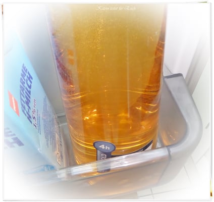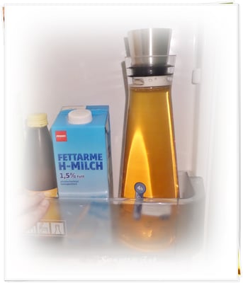 Als ich anfangs den Umfang der Karaffe sah (Durchmesser unten 10 cm und Höhe 31 cm), dachte ich wirklich, die passt doch nie in den Kühlschrank, aber wie man sieht, sie passt und hat sogar noch ein klitzekleines bissel Spielraum.