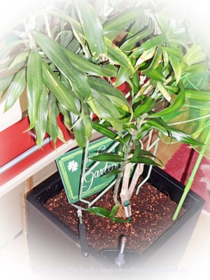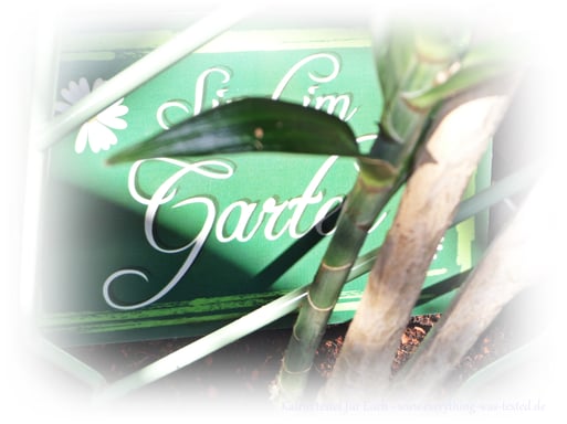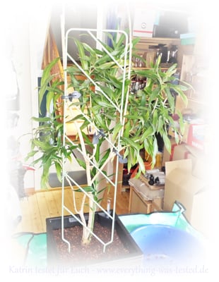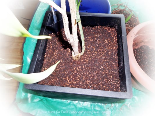 Am Anfang dachte ich, der Pflanztopf ist etwas klein, aber er hat doch ein Gemisch aus ca. 9 Liter Kokoserde und ca. 1 Liter Seramis aufgenommen + Pflanzwurzel. Da meine Pflanze etwas hoch war und gestützt werden musste, kamen gleich die Helferlein von emsa aus einem früheren Test wieder zu Anwendung. (Rankgitter und Pflanzschlaufe/-klammer)