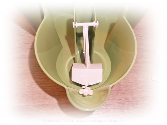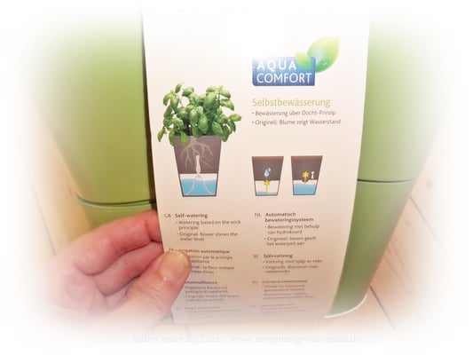 Die Bewässerung wird hier mit Hilfe einer kleinen weißen Blume angezeigt. Die dekorative Blume liegt anfangs flach im Topf und sobald man in die Öffnung etwas Wasser hinein gibt, kommt die Blume immer höher, bis sie zu sehen ist und nicht mehr weiter ansteigt, dann ist genug Wasser enthalten. Finde ich gut, so weiß man immer, wenn Wasser aufgefüllt werden muss.
