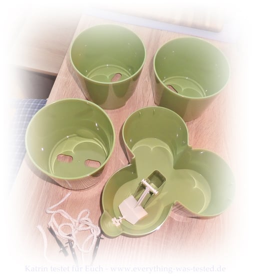 Der weiße Docht wird laut Angabe um den schwarzen Dochthalter gelegt und etwas angefeuchtet, danach wird der fertige Dochthalter von unten in die Erde des jeweiligen Pflanztopfes gedreht. Die drei Pflanztöpfe auf den Dreier-Untertopf stellen und Wasser ins Bewässerungsfach (kleine weiße Blume) geben.
