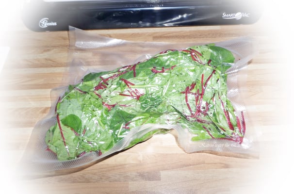 Weil mein gekaufter Salat immer im Kühlschrank nicht so lange hält, dachte ich, da probiere ich gleich einmal die Vakuumfolie aus. Der Salat sah zwar etwas zerquetscht nach dem Vakuumieren aus, aber er hielt sich super über mehrere Tage hinweg.
