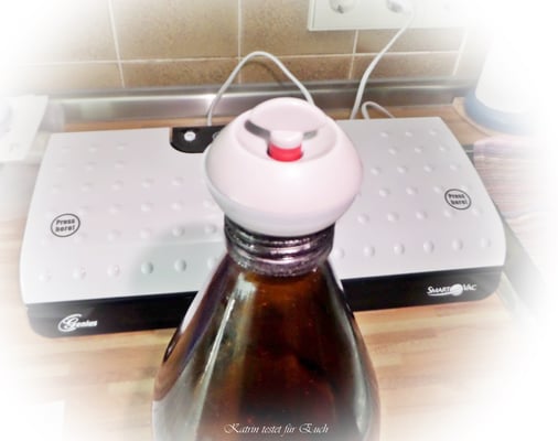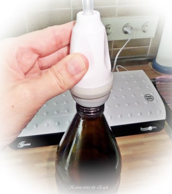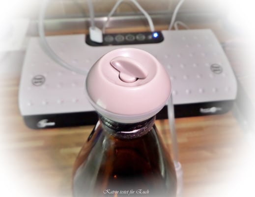 Das Ganze funktioniert genau so wie bei den Aufbewahrungsdosen, also Schlauchpumpe aufsetzen, Luft herausziehen und vom Korken entfernen. Später beim Öffnen hört man einen langen Seufzer und das bedeutet, dass die Luft wieder entweicht :) ...