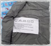 Im Innenfutter/ - material ist noch mal eine kleine Beschreibung zum Schlafsack (Bild 6) und eine Pflegeanleitung.(waschbar bei 30°, keinen Weichspüler und nicht bügeln)