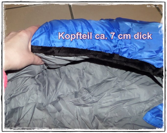 Wie man sieht (Bild 2 und 3) im Schlafsack ist richtig viel Platz und man hat viel Freiheit zum Drehen und Wenden. Das Kopfteil kann man über die Ohren/Kopf ziehen oder man legt sich darauf. (es ist schön dick)
