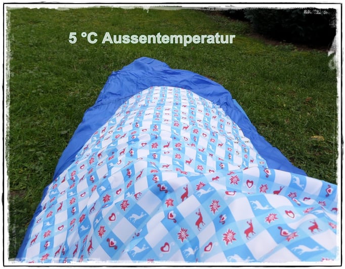 Bei einer Außentemperatur von 5 °C habe ich den Schlafsack dann getestet und musste feststellen, obwohl ich nur mit Wollsocken im Schlafsack lag, war es richtig schön gemütlich.