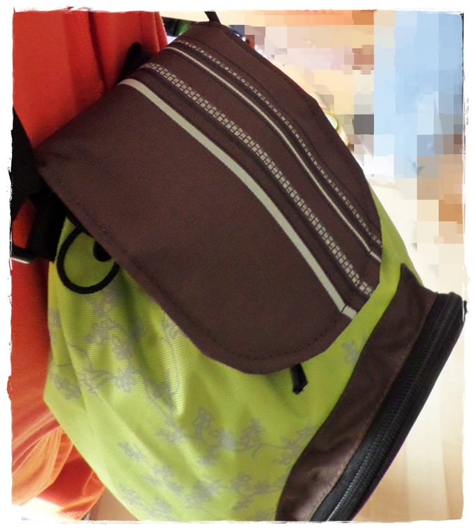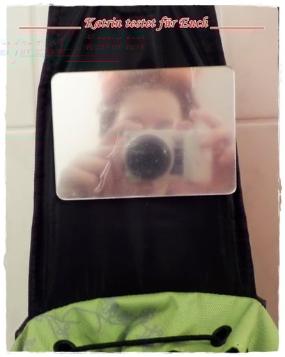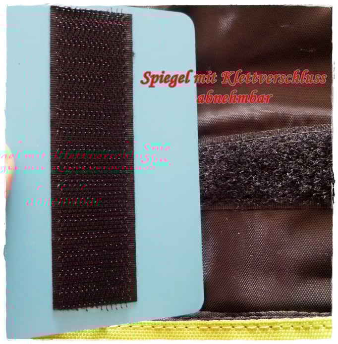 Am Deckel des Rucksackes befindet sich ein Spiegel (unten ist noch mal ein Bild davon), der mit Hilfe eines Klettbandes befestigt ist, also auch bequem abnehmbar ist. Der Spiegel hat bei Lieferung eine Schutzfolie (Bild 4), die man natürlich entfernen muss.