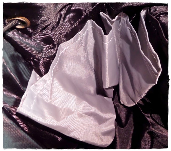 Zusätzlich verbirgt sich eine Überraschung im Deckel des Rucksackes. Da war eine Tasche/Öffnung (Bild 5) neugierig wie man ist, wird natürlich gleich einmal am darin endenden Band gezogen und was kam heraus ? Ein Türhaken/Griff eines Kleiderbügels (Bild 6) - * cool, war echt überrascht was Markus da wieder auf die Beine gebracht hat.