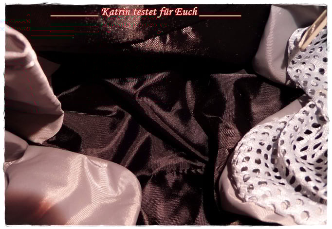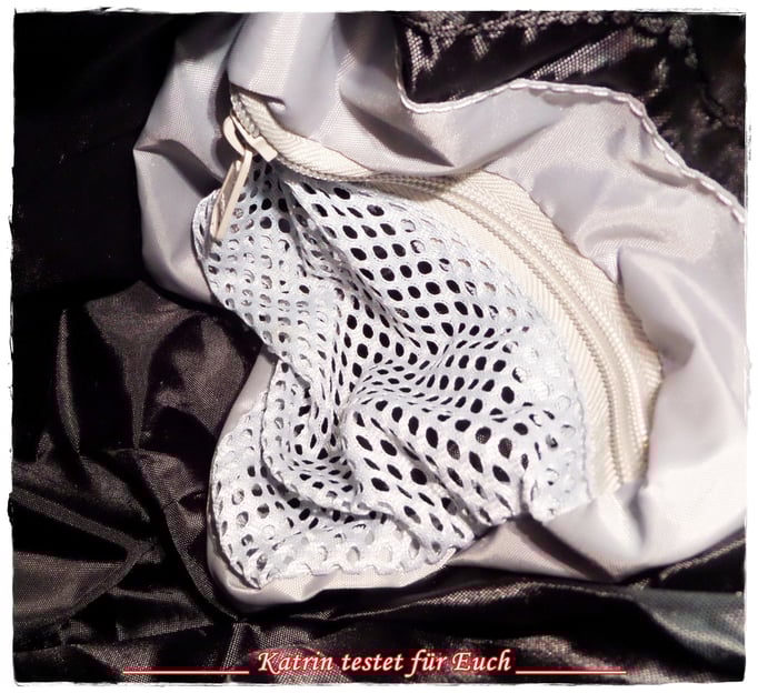 Zunächst am linken Rand befinden sich 3 unterschiedlich große Taschen/Einschübe, genau in der Mitte, also an der Rückwand befindet sich eine größere Tasche/Einschub und an der rechten Seite eine Netztasche mit Reissverschluss. Super, also kann man viele unterschiedliche Dinge darin verstauen.