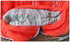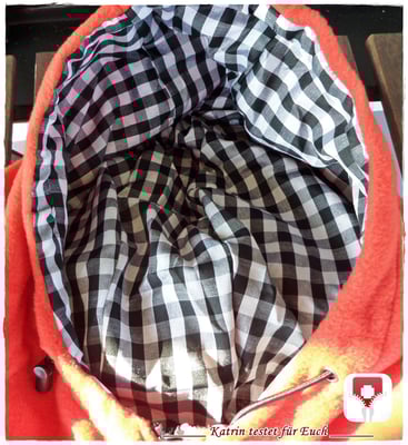 Der Schlafsack wurde an den Ärmeln (Bild 2 unten) und an der Kapuze (Bild 2 oben) durch ein Innenfutter (schwarz kariert) noch einmal extra verstärkt. (hält so noch einmal wärmer)