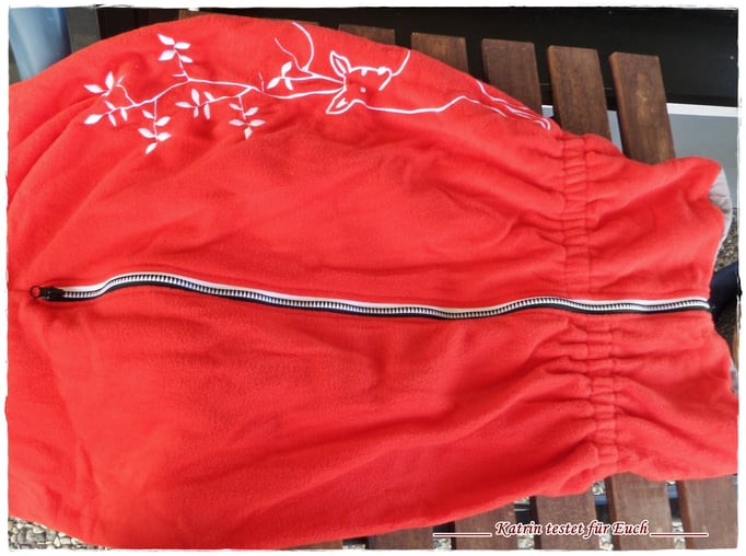 Die Farbe (rot) gefiel mir schon mal sehr gut, weil es meine Lieblingsfarbe ist und auch die optische Gestaltung des Schlafsackes gefällt mir sehr gut.