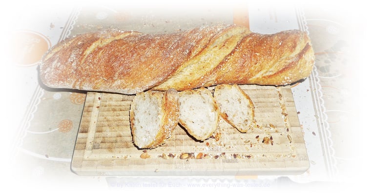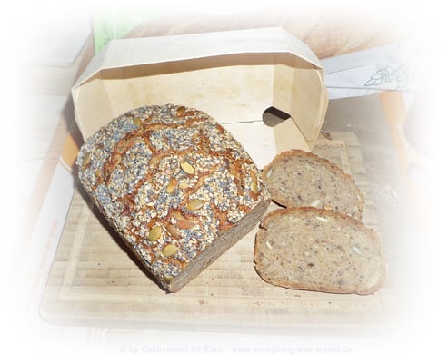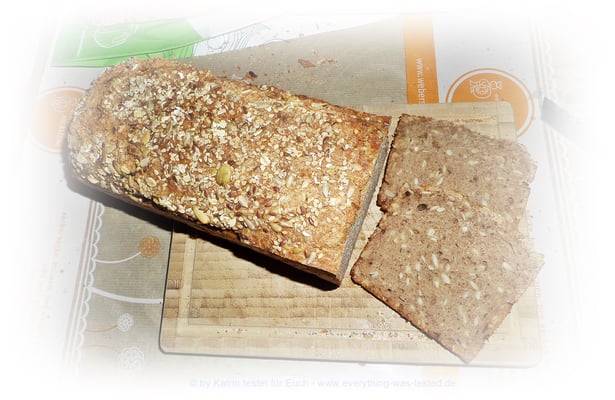 - die Kruste ist gut mit Körnern belegt (Sonnenblumenkerne, Kürbiskerne, Sesam, Leinsamen)