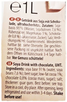Zutaten: Sojabasis 91 % (Wasser, SOJABOHNEN 7,6 %); Rübenzucker; Magerkakao 1 %; Schokolade 0,8 % (Kakaomasse, Zucker); Salz; Verdickungsmittel: Guarkernmehl.