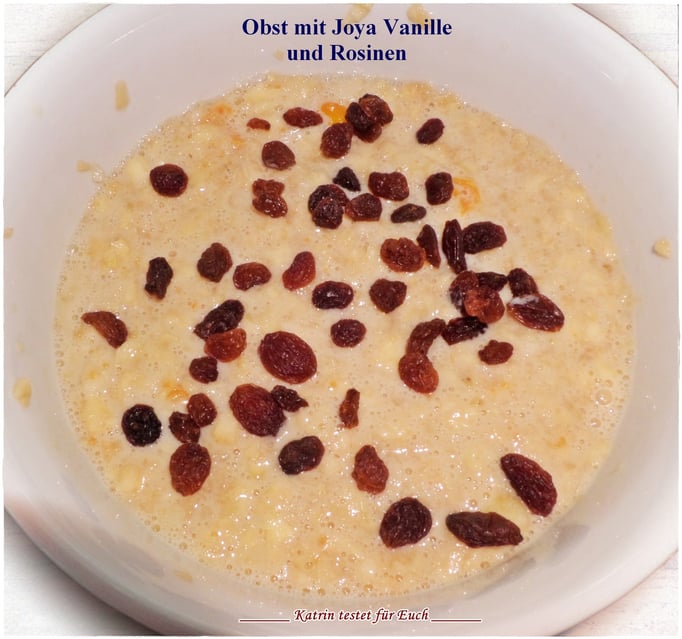 Zutaten: Banane, Physalis, Apfel, Birne, Rosinen, Joya Soja Vanille Drink