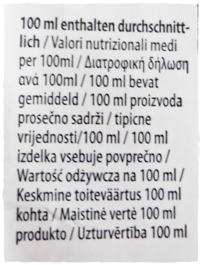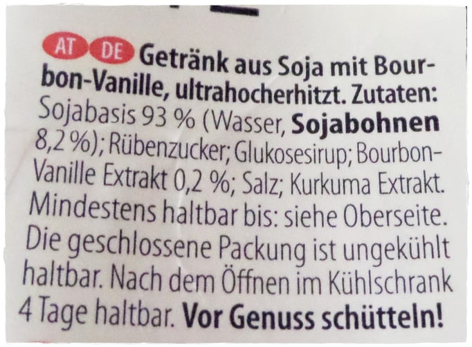 Zutaten: Sojabasis 93 % (Wasser, SOJABOHNEN 8,2 %); Rübenzucker; Glukosesirup; Bourbon-Vanille Extrakt 0,2 %; Salz; Kurkuma Extrakt.