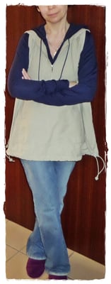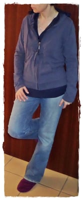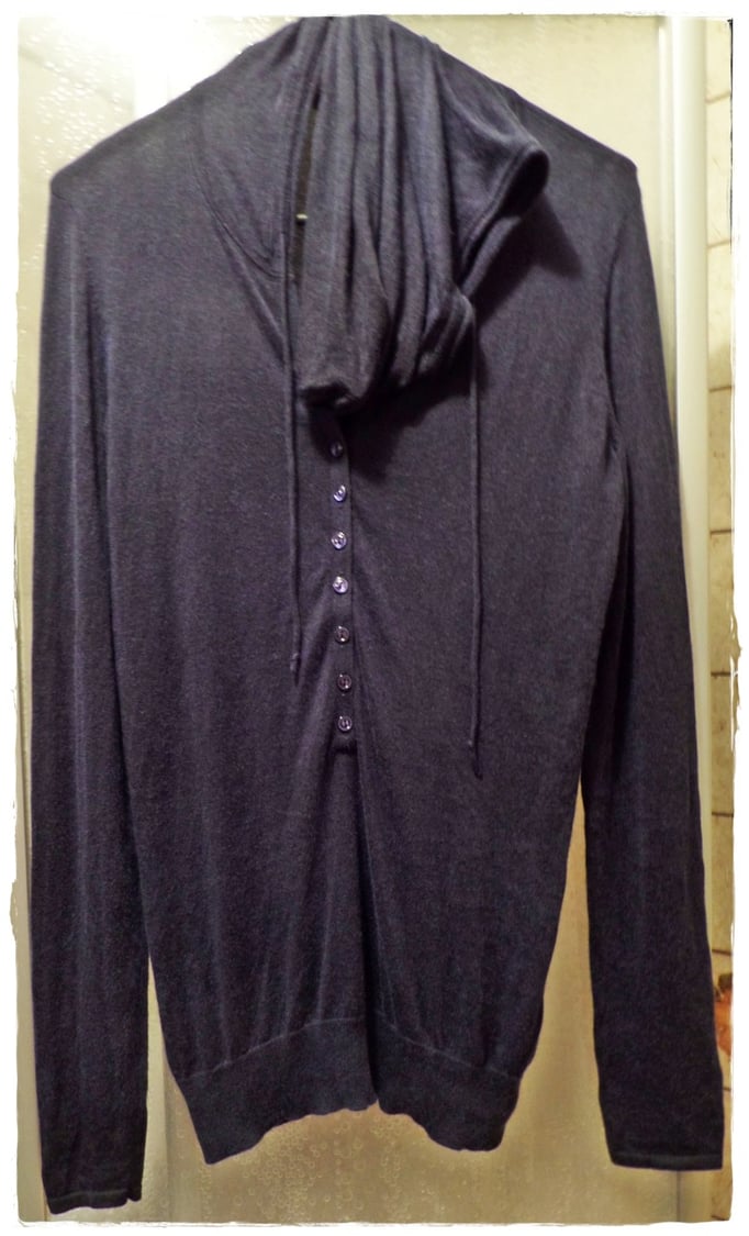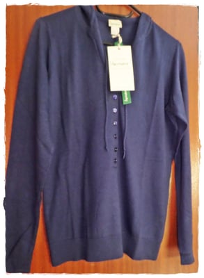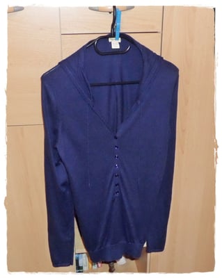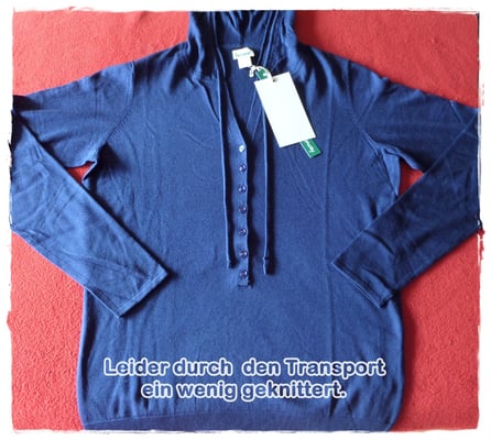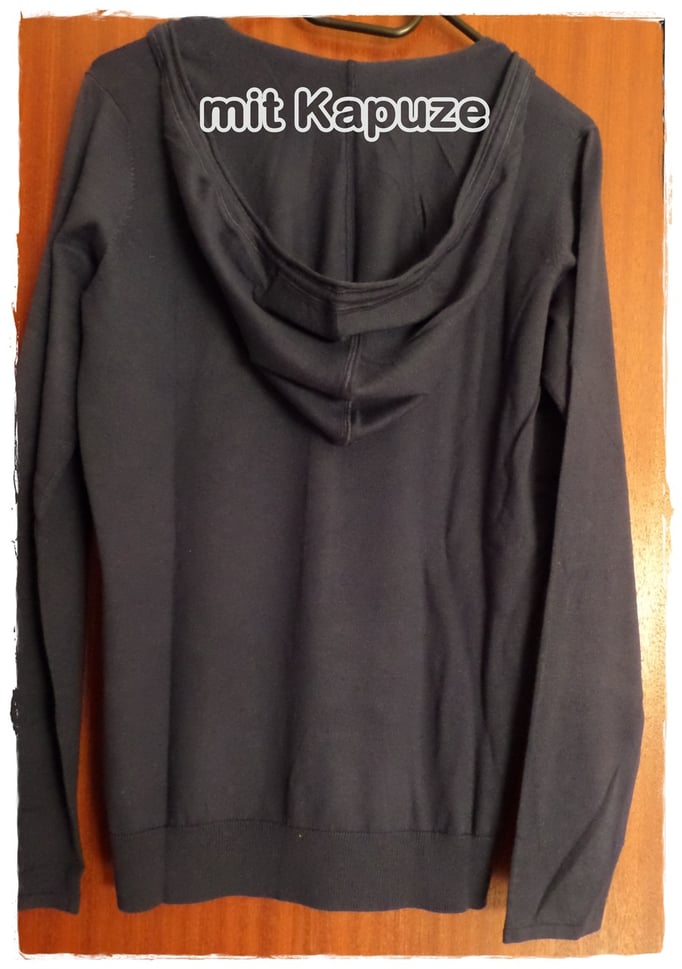 Der Pullover hat eine marineblaue Farbe (gefällt mir gut) und ist mit einer Kapuze ausgestattet. Er hat einen V - Ausschnitt und unterhalb dessen befindet sich eine Knopfleiste mit 7 kleinen blauen Knöpfen.