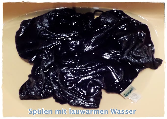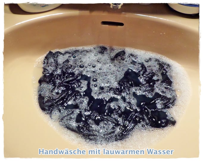 Also nur Handwäsche, ok also etwas lauwarmes Wasser ins Waschbecken, ein wenig Waschmittel dazu und das gute Stück ein bisschen ins Wasser gedrückt, um die Fasern nicht ganz so zu strapazieren.
