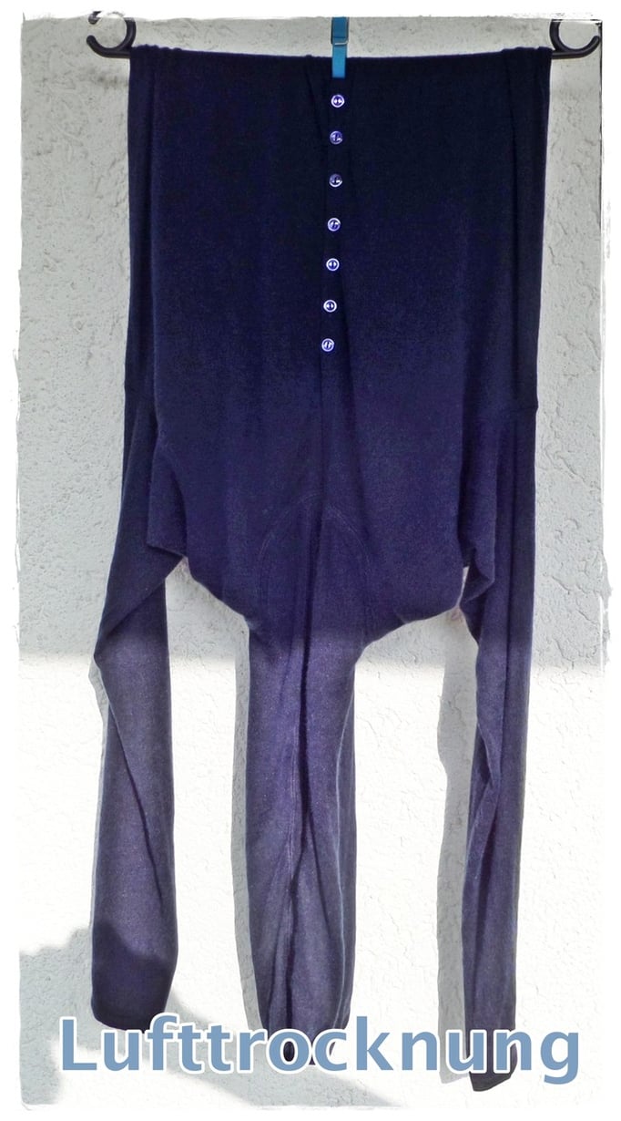 Nach dem Aufhängen habe ich versucht ihn noch ein wenig zurecht zu ziehen, was eigentlich sehr leicht war, aber die schwer Kapuze zog den Pullover immer wieder nach hinten herunter, so dass ich beschloss, die Kapuze noch vorn zu hängen und das Ganze für kurze Zeit auf den Kopf aufzuhängen.