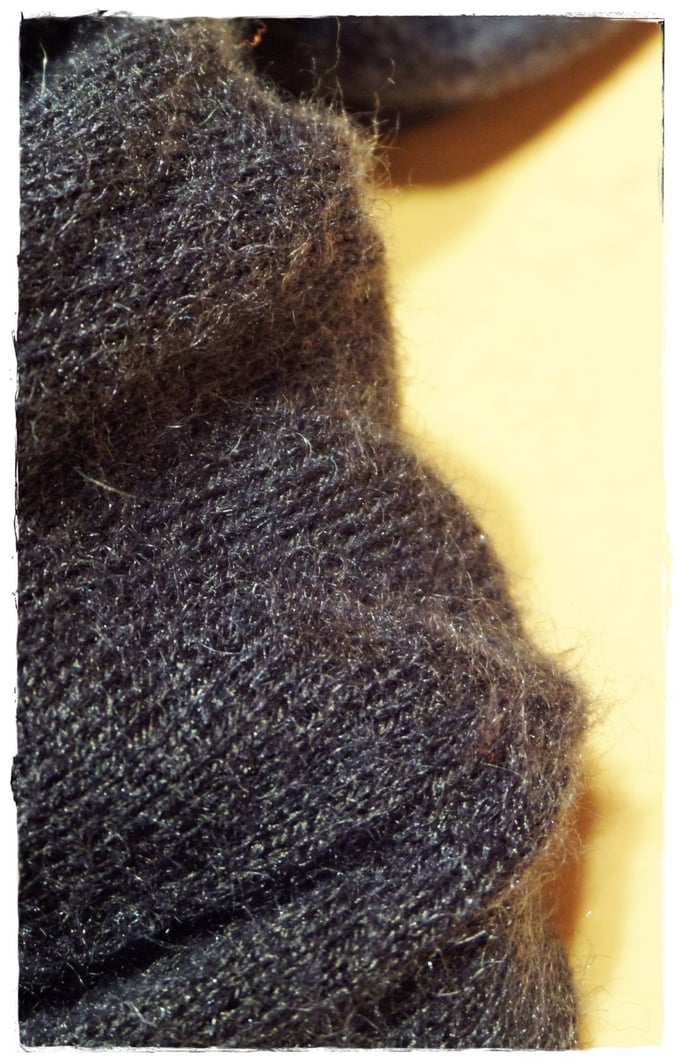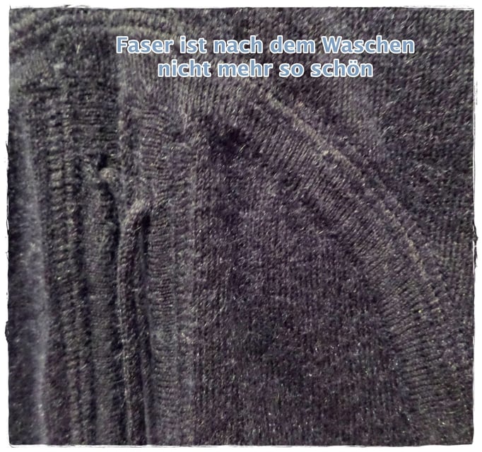 Da der Pullover nicht so dickes Gewebe hat, trocknete er sehr schnell an der Luft und anschließend noch ein wenig im warmen Wohnzimmer aufgehangen, konnte ich mir die Fasern wieder genauer anschauen.