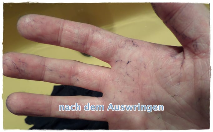 Beim Auswringen wurde es noch mehr, obwohl ich versuchte die Fasern/Pullover so wenig wie möglich zu drücken, aber am Ende waren meine Hände auch noch mit Fusseln/Fasern versehen.