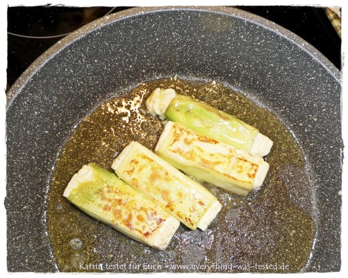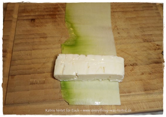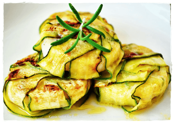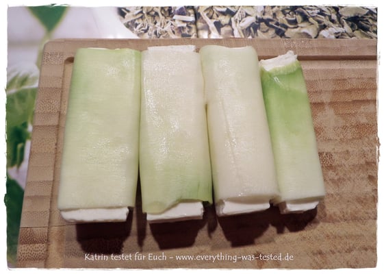 In die Zucchinibahnen werden längliche Hürtenkäsestücke gelegt und aufgerollt. Anschließend die Zucchiniwickel in heißem Öl oder Butter nur kurz braten, weil sonst der Käse zerläuft. Würzen könnt Ihr mit etwas Salz, Pfeffer und Petersilie oder was Ihr gern möchtet 😉 ...