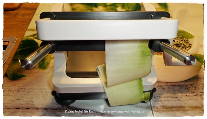 Früher habe ich mühsam mit dem Sparschäler oder Käsehobel ein paar Zucchini- oder Apfelbahnen zu schneiden versucht, was natürlich nicht so gleichmäßig, wie mit dem Bahnenschneider gelingt. Hier spannt man nur das Gemüse oder Obst ein und bekommt in Handumdrehen schöne gleichmäßige superlange Bahnen hin - man kann so viele leckere Gerichte damit zaubern und es sieht auch noch toll aus oder ?