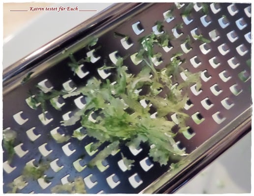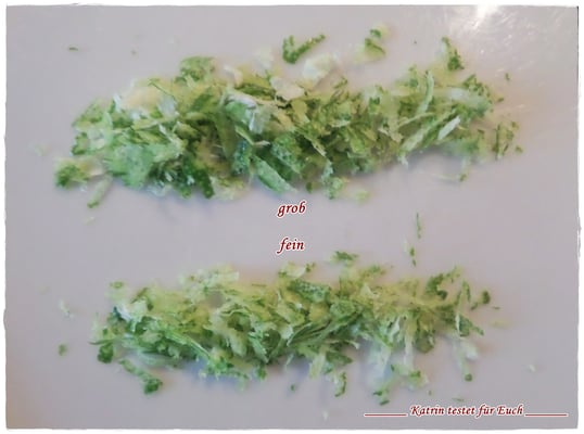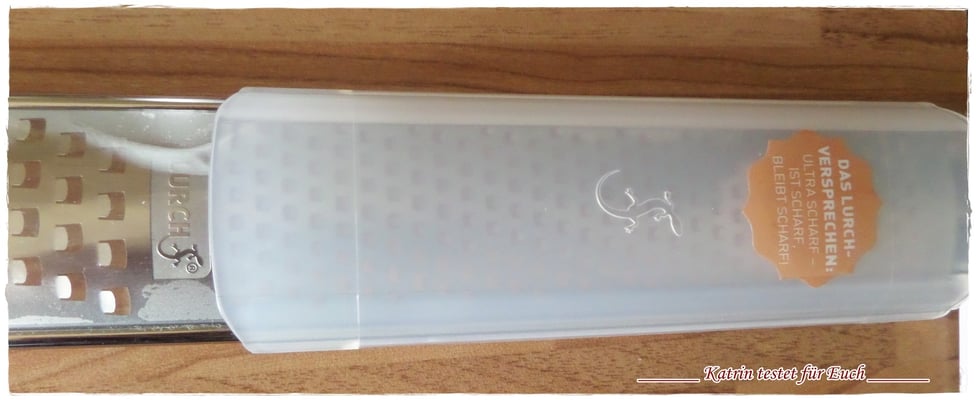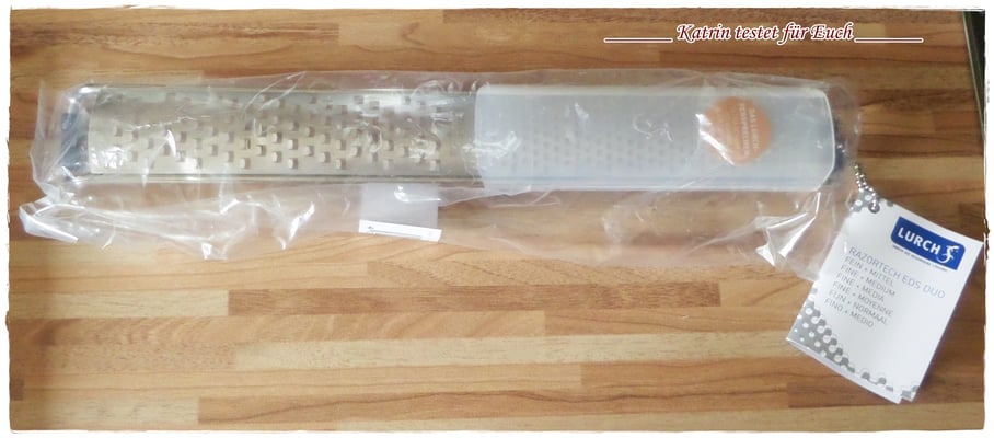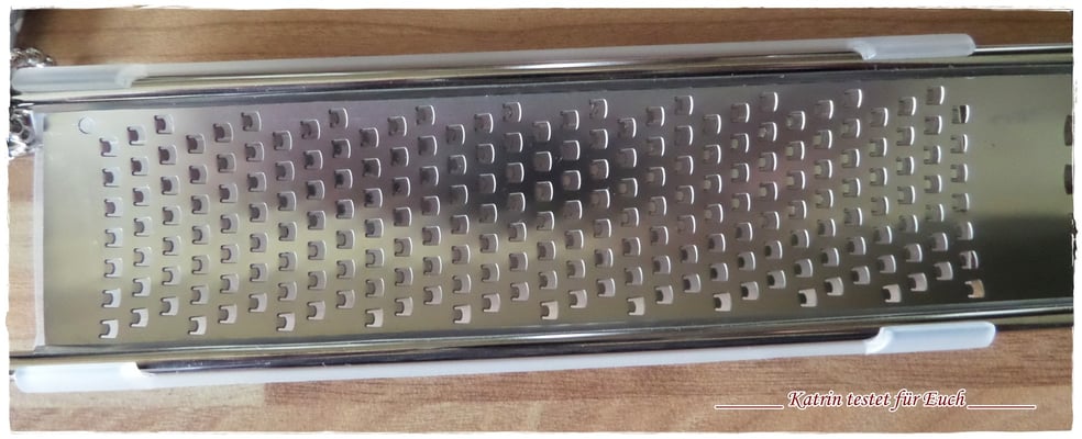 Die Duo Reibe hat zwei Reibeflächen, eine grobe und eine feine. Anfänglich hat sie eine Schutzfolie aufgeklebt, die man zuvor entfernen muss. (ist ja klar)