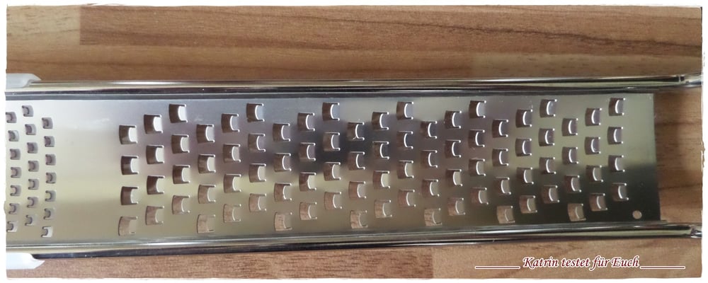 Die Reibe ist mit einen Schutzschieber versehen, den man hin und her schieben kann, um eine Seite (eine Reibefläche) immer zu schließen. Das Ganze dient auch gleich als Griff und die Hand (mit der man die Reibe hält) wird während der Arbeit mit der Reibe geschützt. Das finde ich eine super Idee und ist zudem auch sehr handlich dadurch.