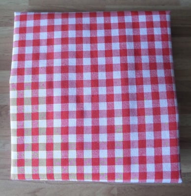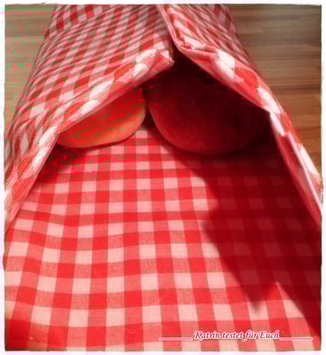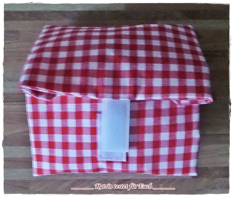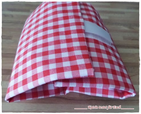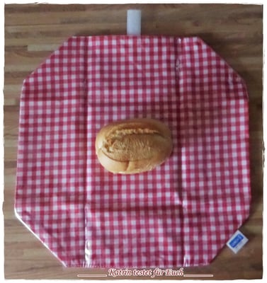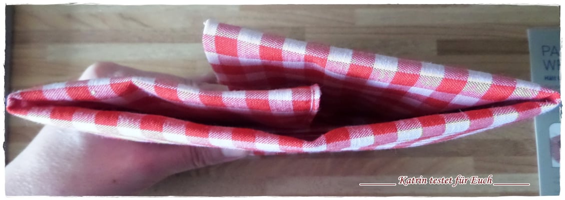 Die Pausenbrottasche ist aussen aus rotem karrierten stabilen Stoff und innen mit einer Folie ausgestattet.