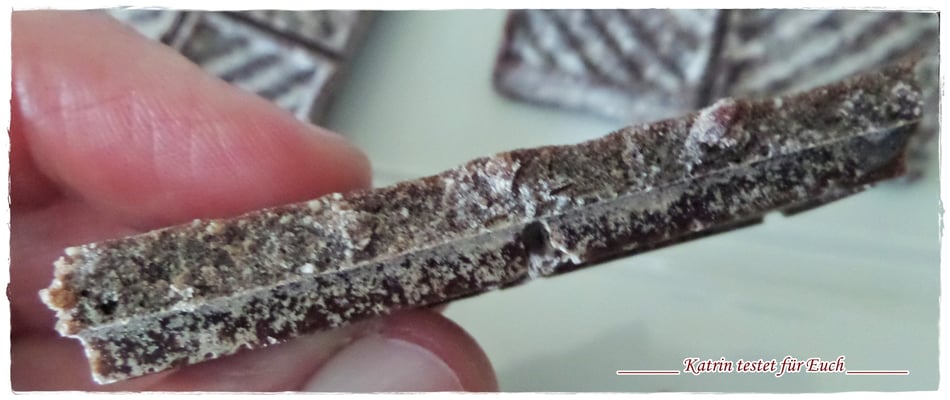 Wie vorher erwähnt , hätte ich sie ein wenig ruhen lassen sollen, hatte ich nicht gemacht und so hat sie natürlich durch den schnellen Temperaturumschwung ein wenig Kristalle gezogen. (dadurch weiße Spuren, ist aber nichts schlimmes) Den Fehler mache ich natürlich bei der nächsten Schokolade nicht.