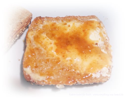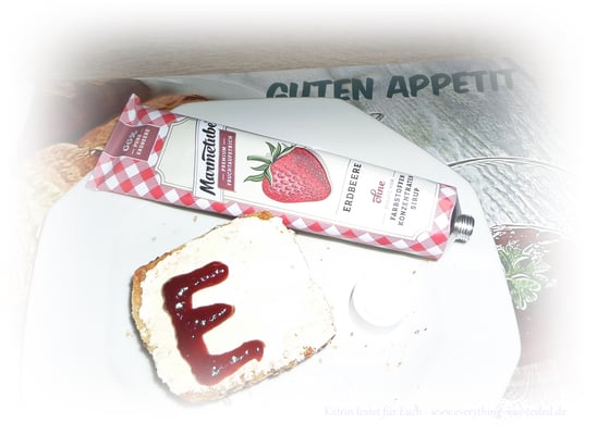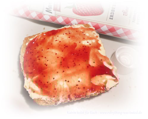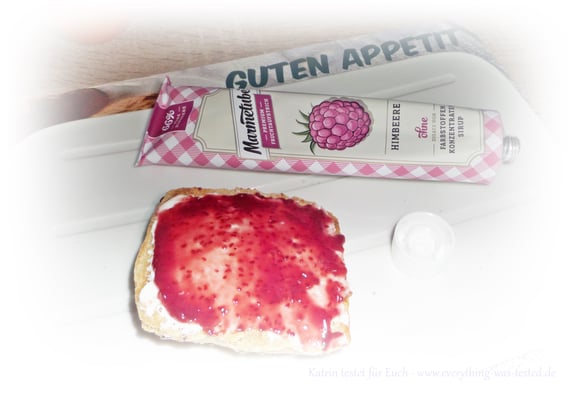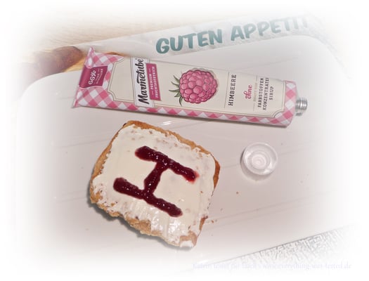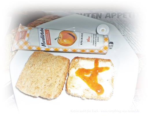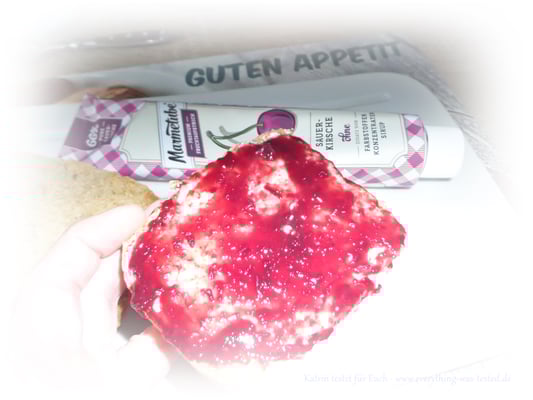 Vor dem Verzerr sollte man die Tube immer etwas schütteln, weil sonst könnte es passieren, dass man nur etwas Flüssiges auf dem Brötchen liegen hat. Der Fruchtaufstrich kann nicht so dickflüssig in die Tube abgefüllt werden, weil man sonst nichts mehr herausbekommt, daher ein wenig schütteln bis man nichts mehr plätschern hört und schon ist alles gut vermischt.