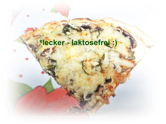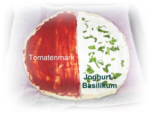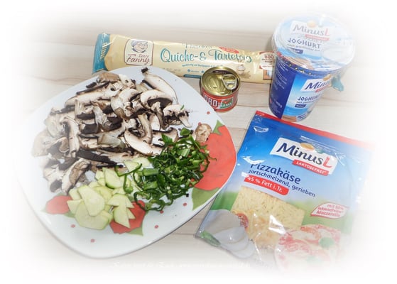 Wenn wir Pizza machen, dann nehmen wir keinen Pizzateig, sondern Quiche-Teig (Tante Fanny) und da ich gerade in der jetzigen Allergiezeit wieder viele Sachen nicht essen kann, muss ich immer improvisieren. Tomate und Co. geht bei mir zur Zeit gar nicht, daher habe ich auf meine Seite den griechischen Joghurt von MinusL und ein wenig frischen Basilikum gegeben - etwas Gemüse dazu (Pilze, Zucchini), sowie einen Hauch getrocknete Minze und frische Zitronenmelisse. Obenauf den laktosefreien Pizzakäse und ab in den Ofen. Es war einfach nur lecker - so darf bei mir Pizza aussehen und schmecken !!!