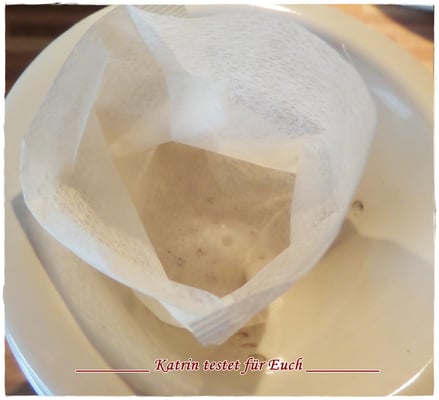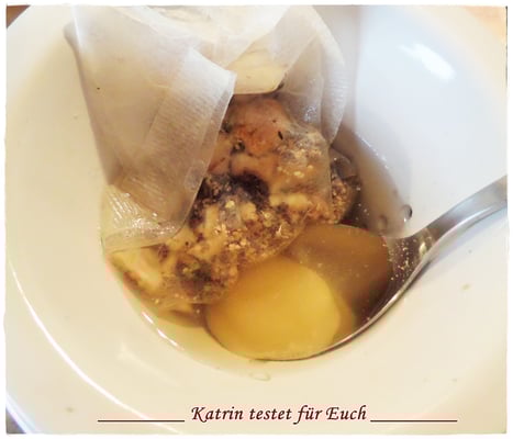 In den Teebeutel, den ich vorher etwas gekürzt hatte, löffelte ich 1 Teelöffel Holunderblüten, 1 Teelöffel Orangenschalen und einen 1/2 Teelöffel Stevia hinein. Um das Ganze etwas interessanter zu machen, gab ich noch 1 Löffel Honig hinein.