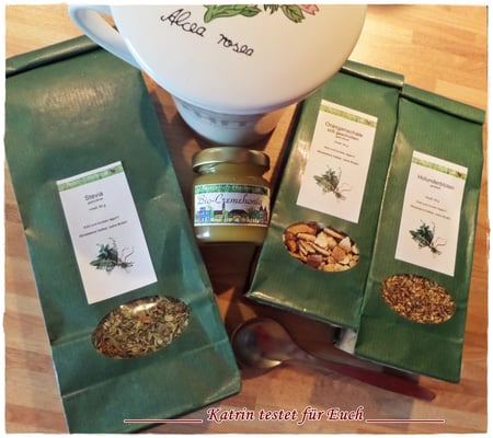 Getestet wurde: Holunderblüten gerebelt 50 g, Orangenschalen süß geschnitten getrocknet 50 g, Stevia getrocknet 50 g und Bio Cremehonig 50g.