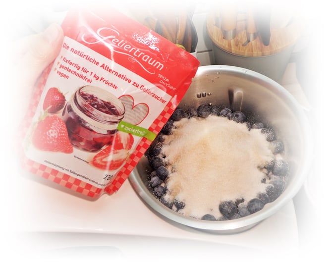 Die frischen Heidelbeeren (1 Kilogramm) abwaschen und in einem Topf, Monsieur Cousine oder Thermomix geben. Dann die 230 g Geliermittel (Geliertraum) dazugeben und unter Rühren ca. 3 Minuten kochen (ab Anfang der Kochzeit wird gezählt).