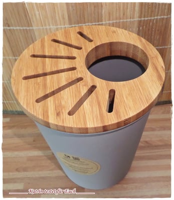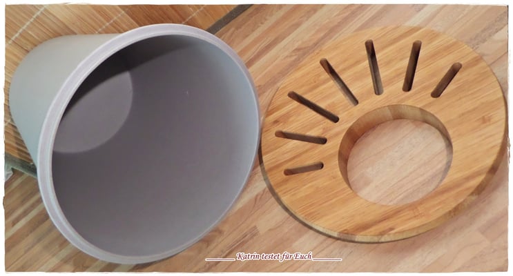 Er besteht aus zwei Elementen, einmal dem runden Behälter (ohne BPA) und einmal dem runden Deckel (Holz)