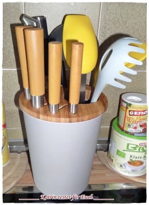 Bevor ich den Zuperzozial Messerblock bekam, hatte ich in meiner Küche zwei seperate Behälter, einen Messerblock und einen Küchenhelferbehälter. Die beiden Teile nahmen natürlich viel Platz weg, aber als der Messerblock kam, habe ich diese sofort entsorgt, denn sie waren auch auch nicht BPA frei.