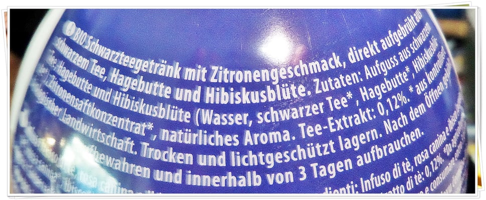 Zutaten: Bio Schwarzteegetränk mit Zitronengeschmack, direkt aufgebrüht aus schwarzem Tee, Hagebutte und Hibiskusblüte - das klingt ja schon mal gut !